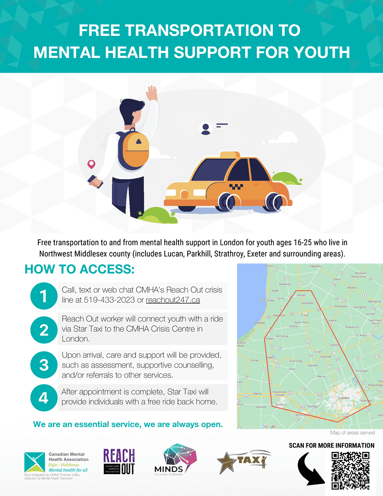 Building on this research, MINDS connected with CMHA, who already had some mobile crisis services within London, but were often limited in which youth they could pick up and bring to services. After consultation, in 2021 we partnered with Star Taxi to offer free transportation to youth in Lucan, Parkhill, Strathroy, Exeter and neighbouring communities.