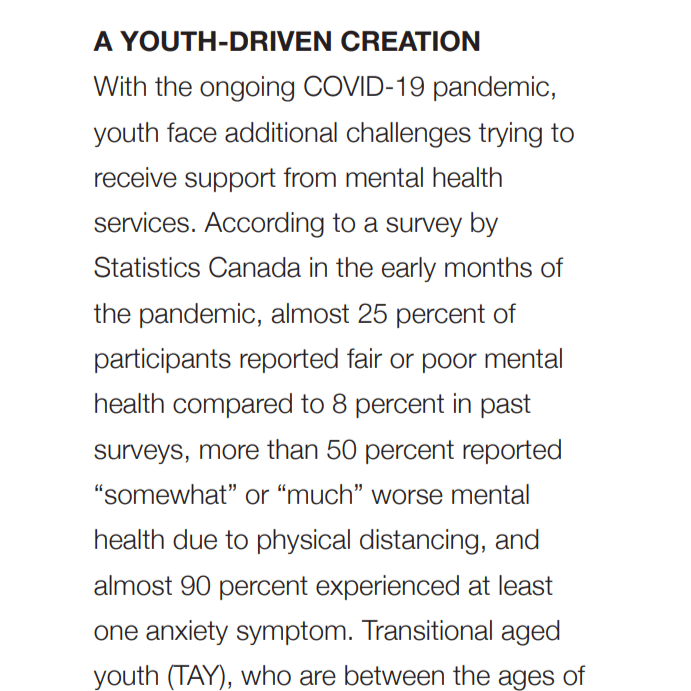 This peer-support guidebook aims to get more youth talking about mental health and self-care, to be a resource used in schools and hospitals by youth and their caregivers, to help youth understand different types of issues beyond depression and anxiety, to address myths about different disorders, to reduce the stigma about mental health and addictions, to let youth know they are not alone, and to help them feel seen on their unique road through recovery.