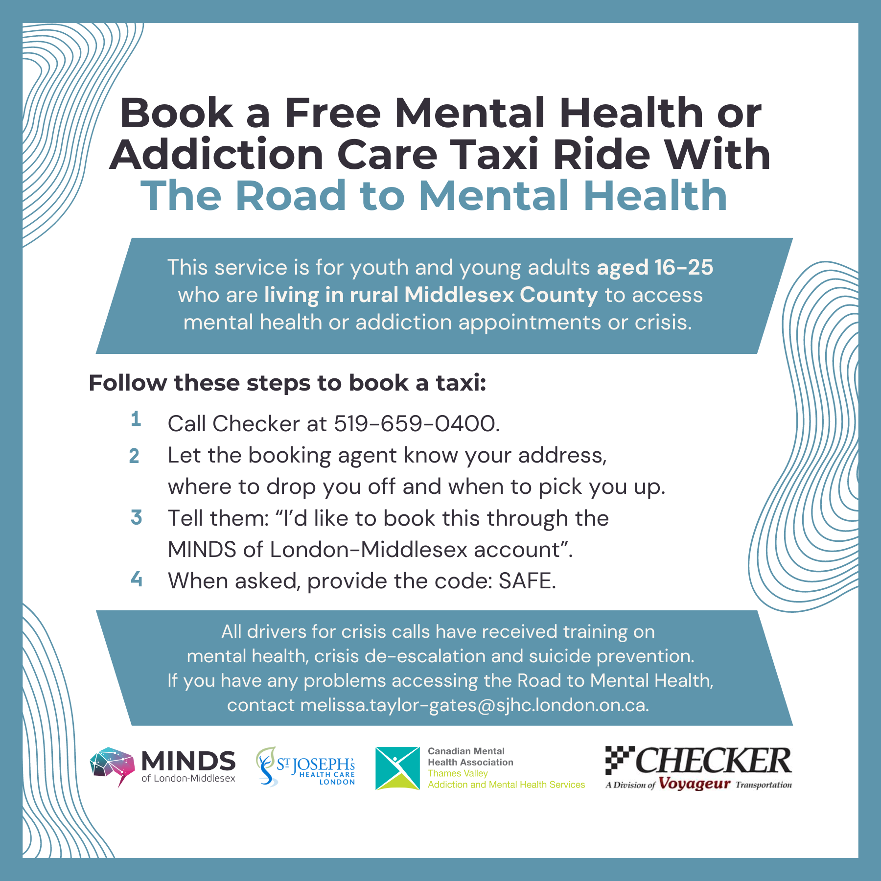 If you’re a youth in need of mental health or addiction support and transportation is a concern, you can reach out to Reach Out via phone, text, or webchat at 519-433-2023 or visit www.reachout247.ca. They will assist you in booking a free ride with Checker or Star Taxi to your appointment or crisis service. All drivers have opted into this program and are trained in mental health, crisis de-escalation, and suicide prevention to ensure your safety and well-being during the ride.