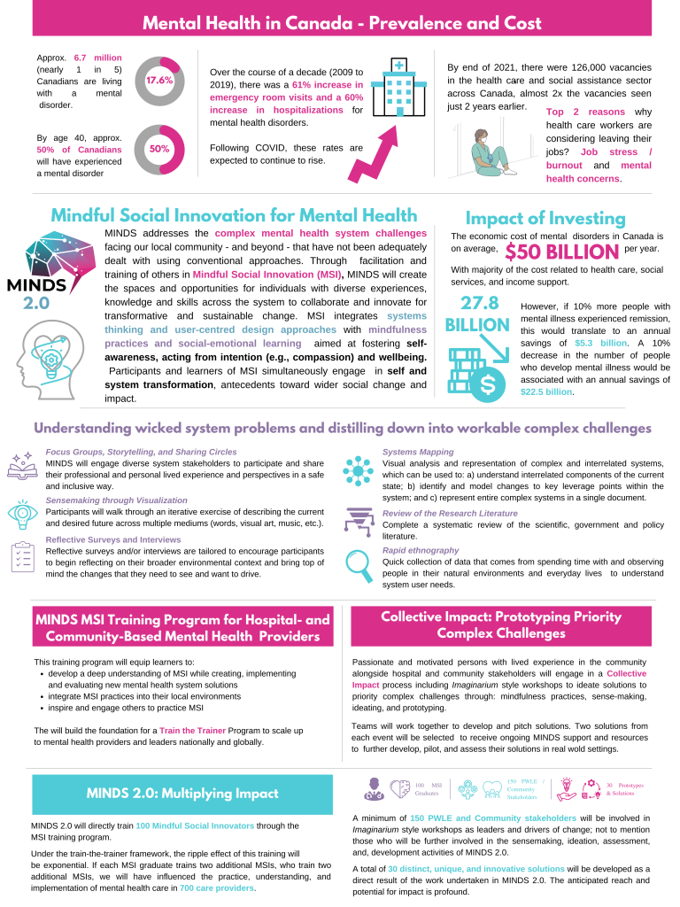 MINDS 2.0 will revolutionize how we approach mental health challenges by engaging community members with the necessary tools, connections and resources to take care of themselves and their neighbours, so that all can live with flourishing mental health and wellbeing.